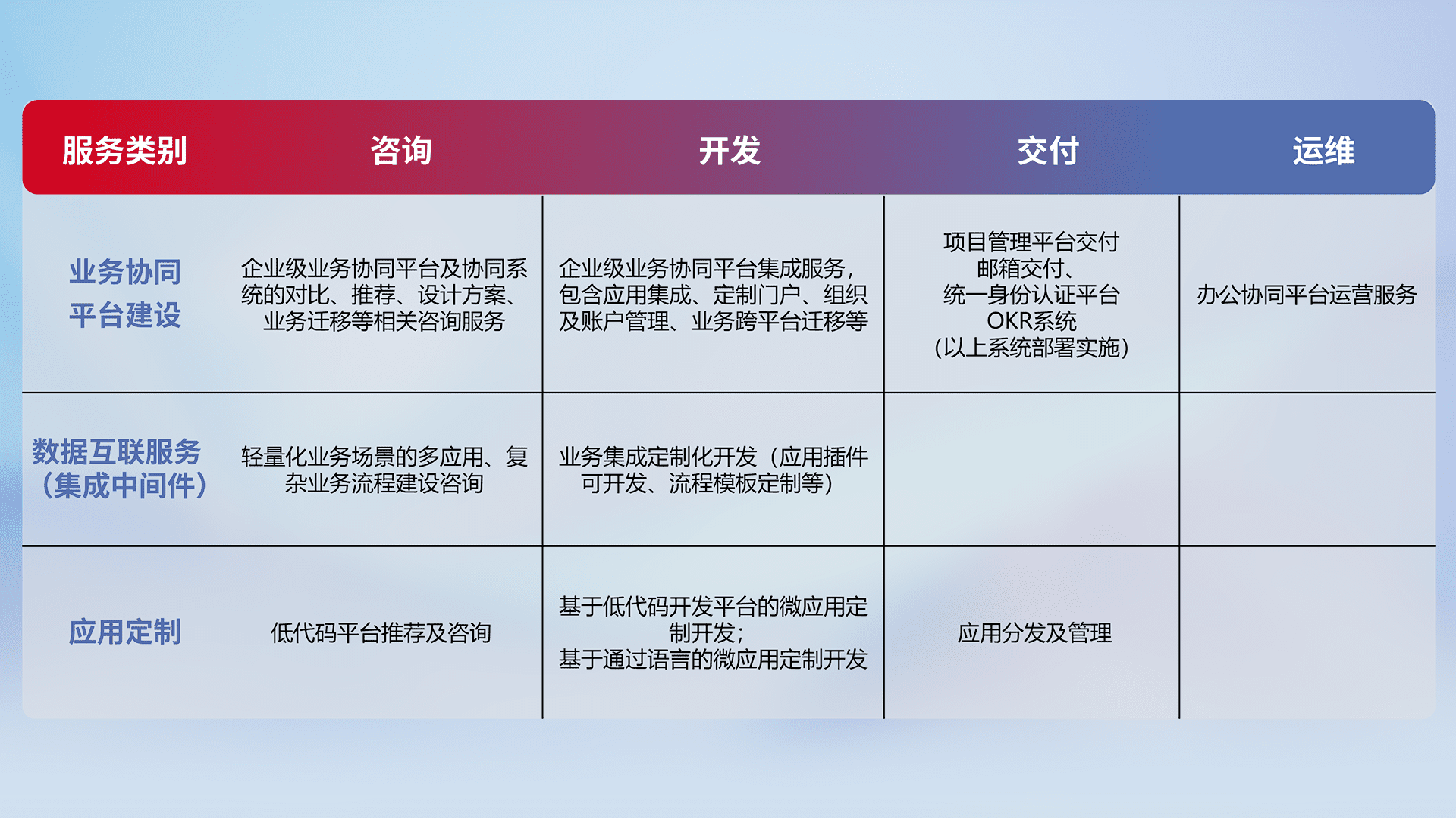 针对钉钉、、企微、、、、IDaas等平台级产品提供产品的规划、、、、方案、、、、交付、、定制化开发等服务,,实现如统一协同办公、、、智能客户服务、、、、混合会议管理、、智能数据查询、、、等业务场景,,,实现数字化转型。。